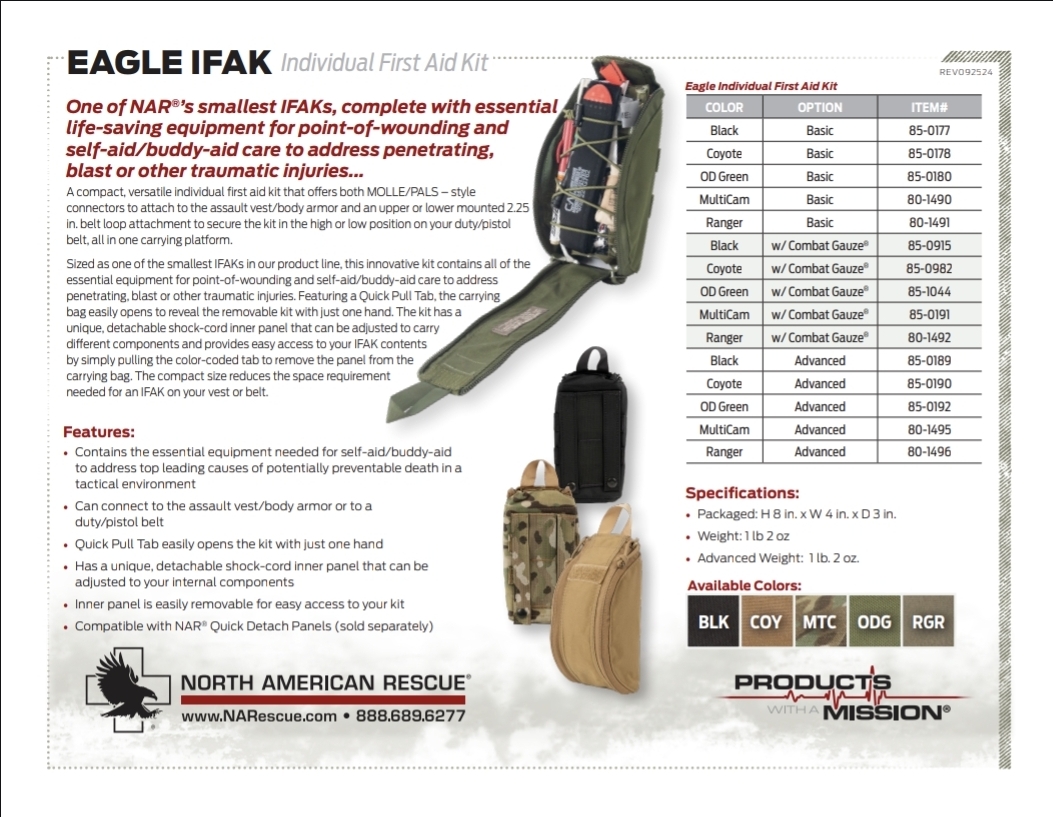 De Eagle IFAK is een compacte, veelzijdige individuele EHBO-kit die zowel MOLLE/PALS-stijlconnectoren biedt die aan het aanvalsvest/lichaamspantser kunnen worden bevestigd als een op het boven- of onderwerk gemonteerde 2,25 riemlusbevestiging om de kit in de hoge of lage positie op uw dienst/wapengordel te bevestigen, allemaal in één draagplatform. Deze innovatieve kit is een van de kleinste IFAK’s doch nog efficiënte IFAK’s en bevat alle essentiële middelen voor zelfaid/buddy-aid om penetrerende blanke of vuurwapen, explosie of andere traumatische verwondingen te behandelen. Met een Quick Pull Tab opent de draagtas gemakkelijk om de verwijderbare kit met slechts één hand te te openen.